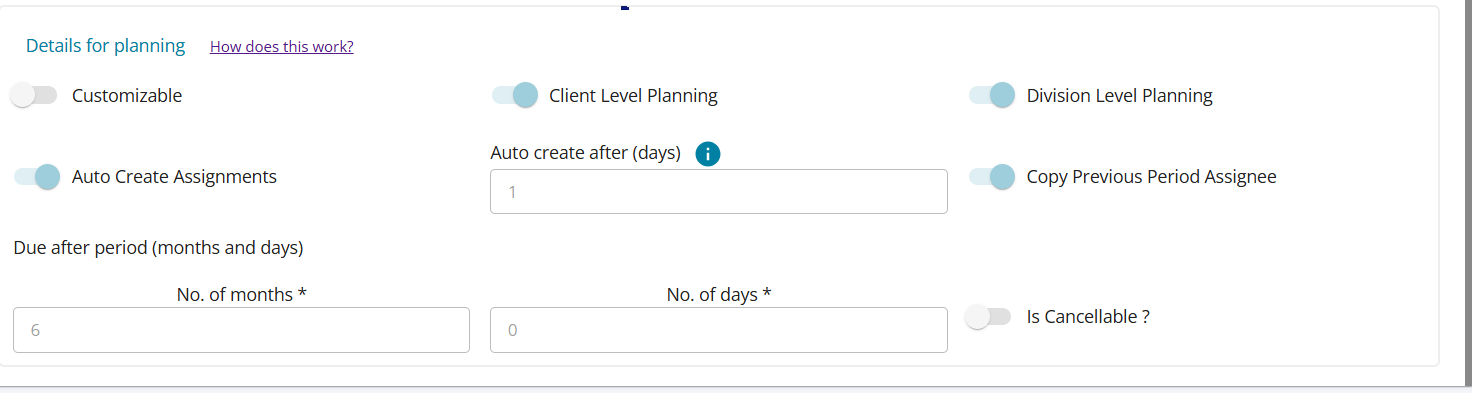 - If you want the newly planned assignments to have the same maker / checker / approver names, set “Copy previous period assignee” to ON