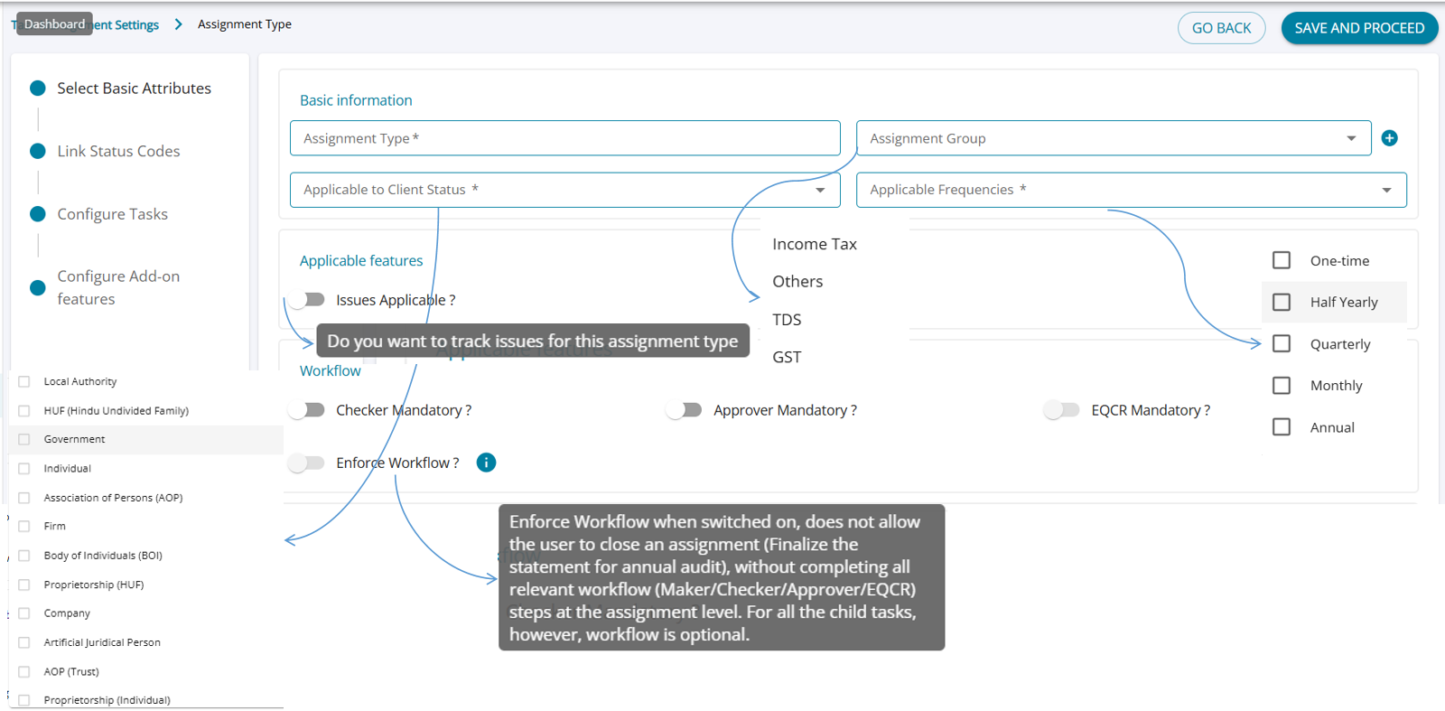 - Users can define the Assignment Type name ( user enterable) , Assignment Group, Client Status, and Applicable Frequency.