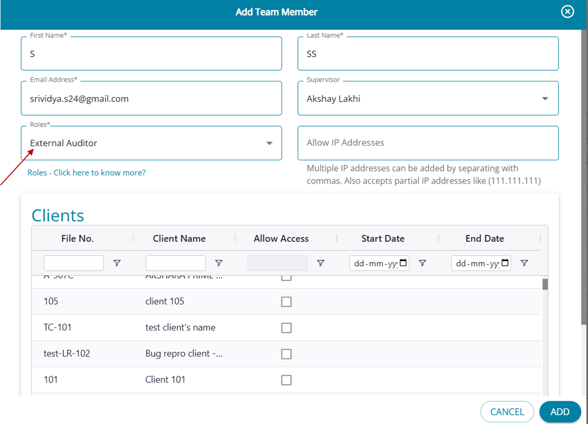When the user is added/edited and assigned the role of an External Auditor, the screen additionally lists the entire set of clients in the firm. Users will have to choose the clients for which the external auditor has access to.