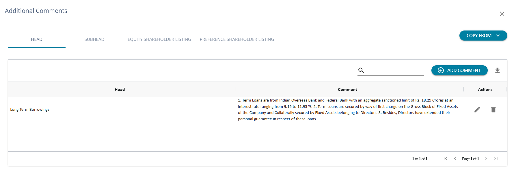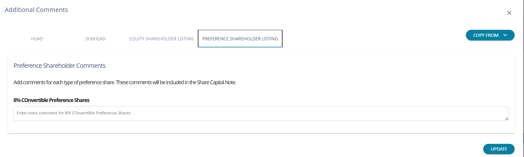 For each type of preference share added to the client onboarding screen, a tab is included in the comments page. AssureAI does not populate any predefined comments for preference shares. Based on the type of share, comments can be entered by the user to be included in Note -1