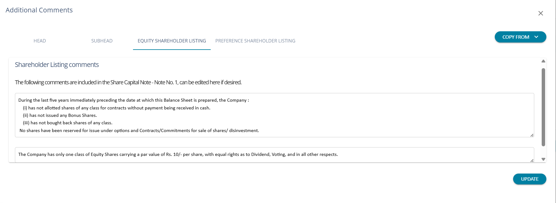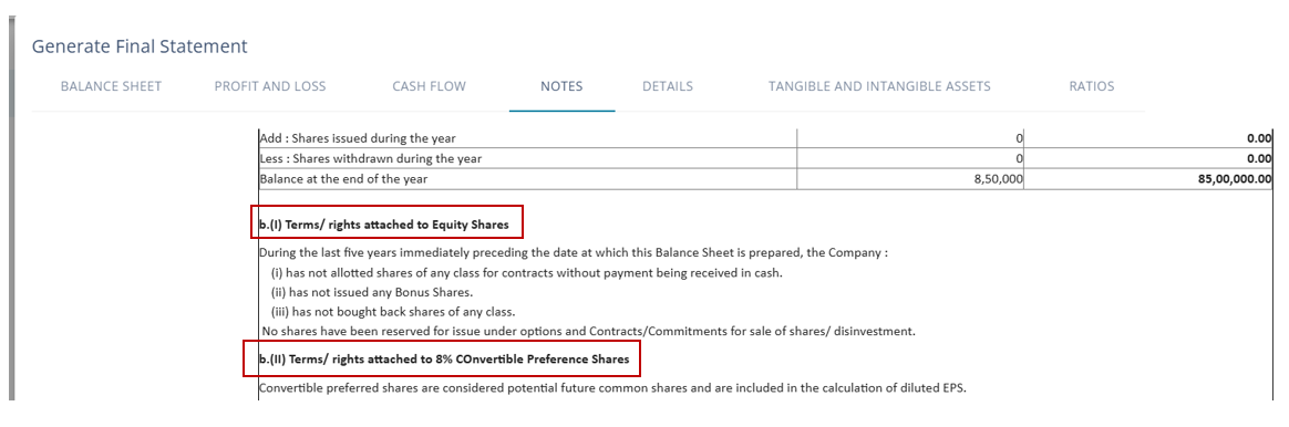 The share capital details for Note 1 can be entered into this section. Default comments are added to the section; however, if required, the user can change the comments.