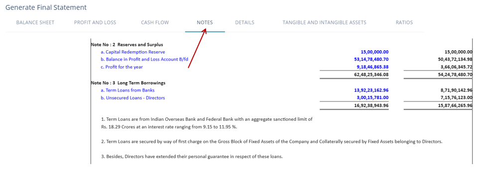 In addition to the various comments and disclosures that are to be appended to Financial Statements, certain additional notes/comments need to go as part of the financial statement note section, for eg, various additional details to be given as part of the Note about Long Term and Short Term Borrowings, etc.
