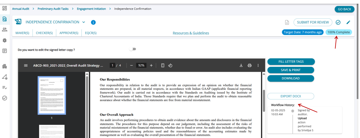 8.The uploaded letter is displayed with all details filled and with signatures and the workflow history is now displayed.