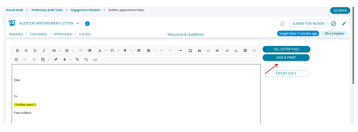 - The audit team must mark the required letter tasks as applicable. Once marked, they will appear under the Engagement Documents module in the client’s login.