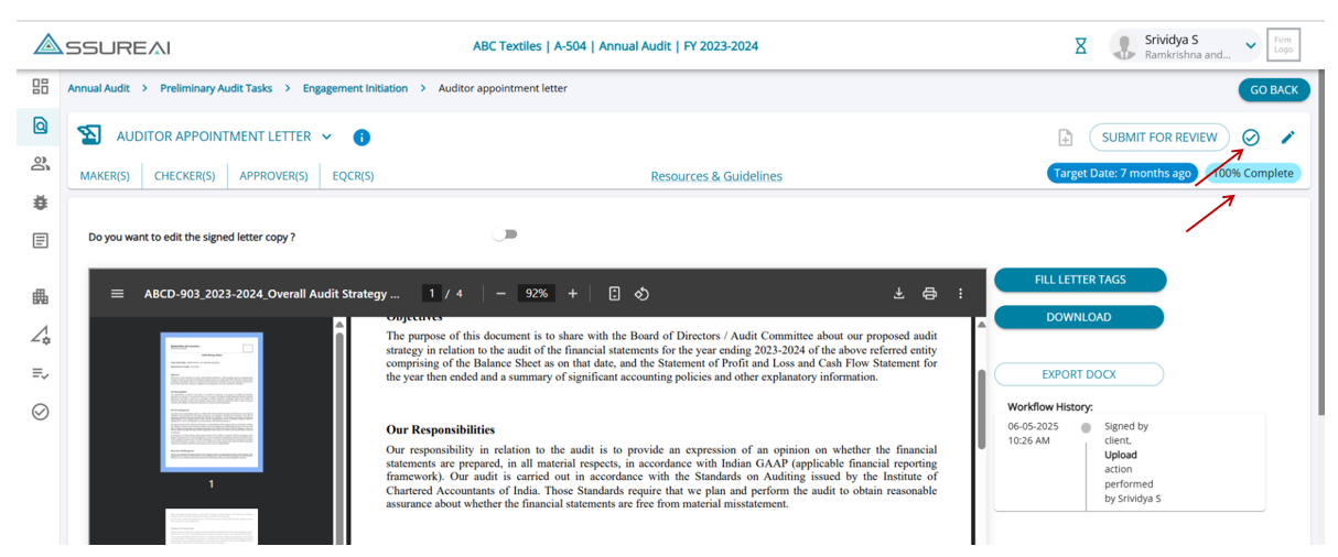 - Once the client has completed the task, firm users can refresh the task to view the uploaded letter along with the workflow history.