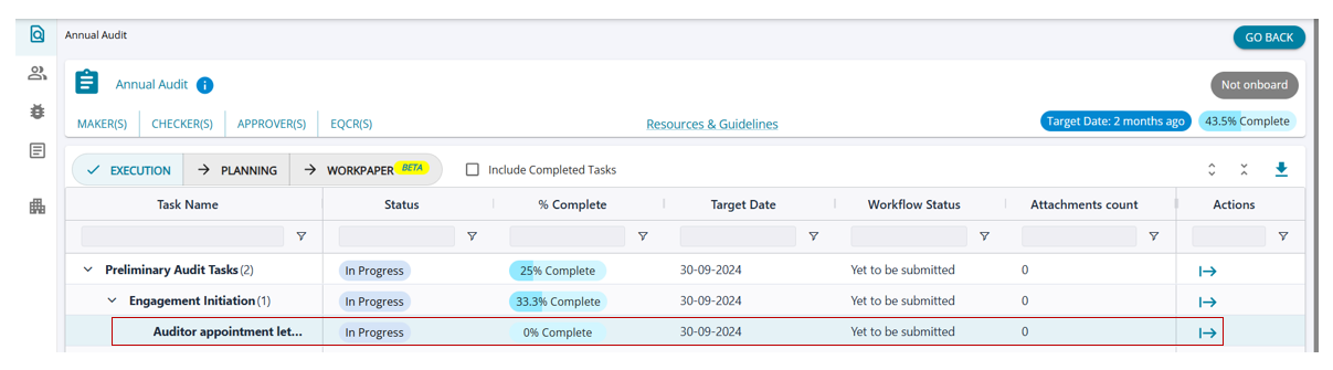 - The task will display as 100% complete, allowing the firm user to mark the letter task as completed in the system.