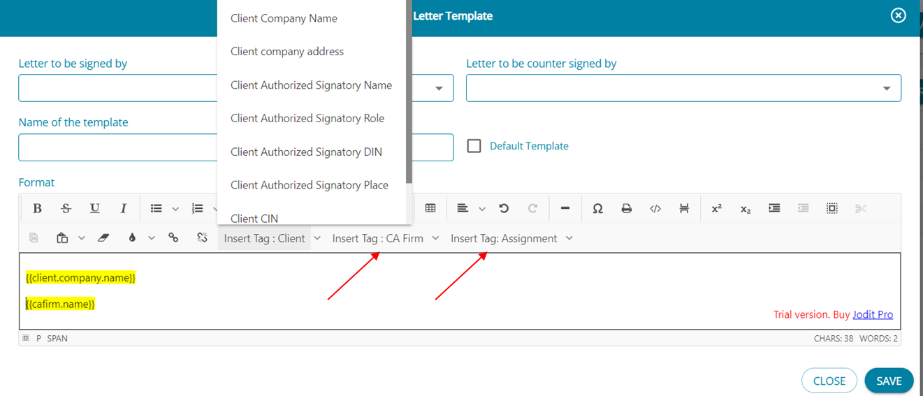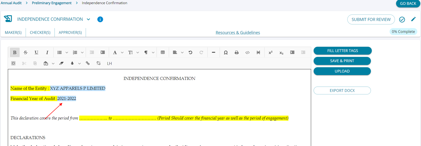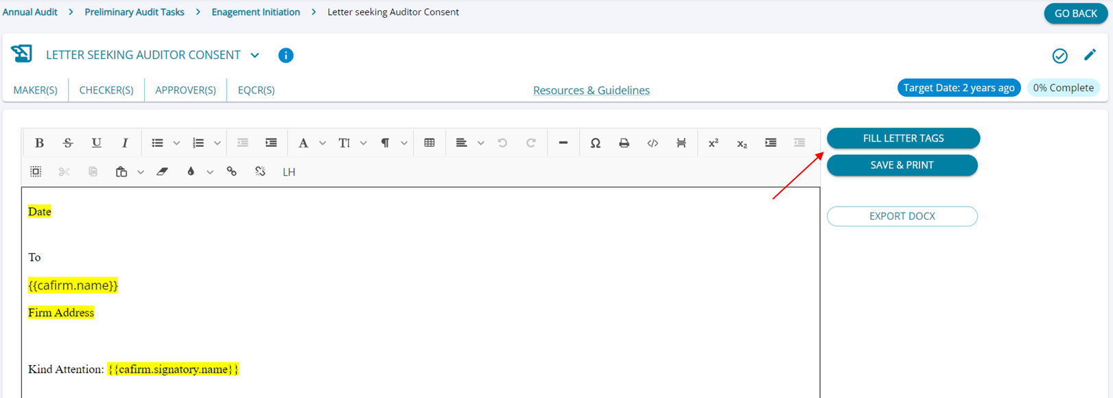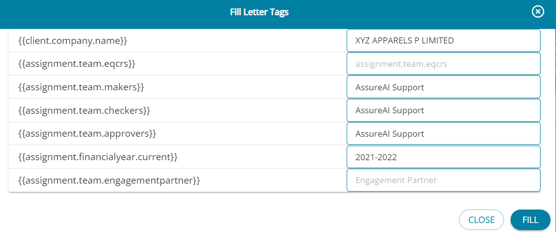 3. When the 'Fill Letter Tags' button is clicked, a pop-up displays all the available tags for the letter. Wherever tags are not available, the fields will be disabled, and the tags must be filled in manually by the user.