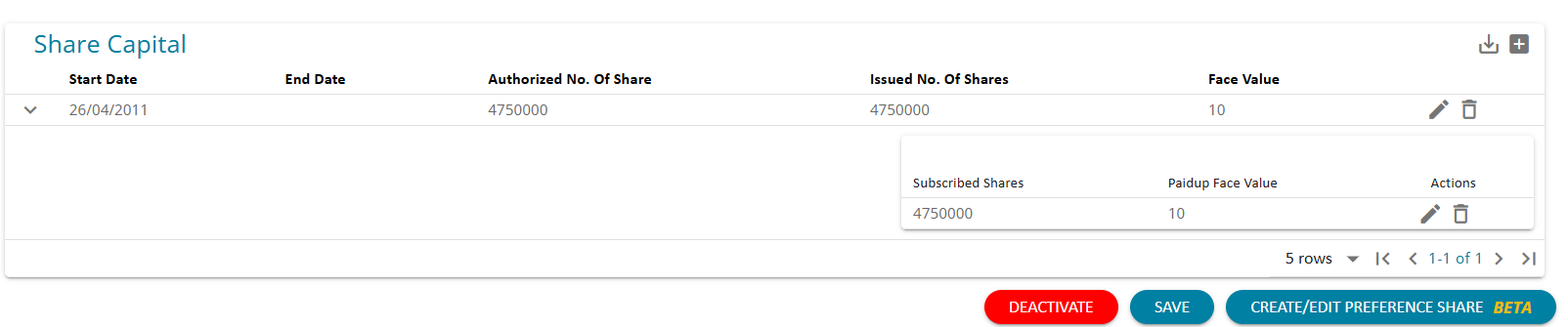 2. By clicking on the down arrow next to the Start date the user can add the details of the subscribed share capital details in the pop up that opens .