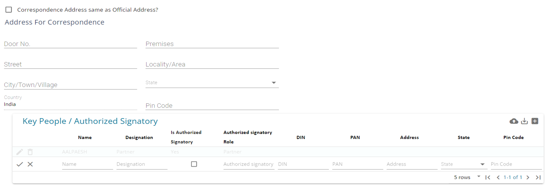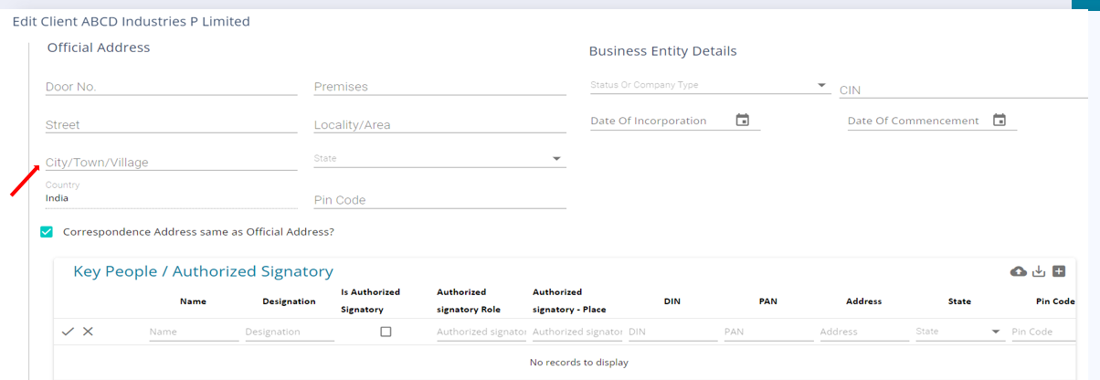 1. To add the Key people / Authorized Signatory Table – press the ‘+’ button on top right of the table and enter details of Key persons in the client entity.
