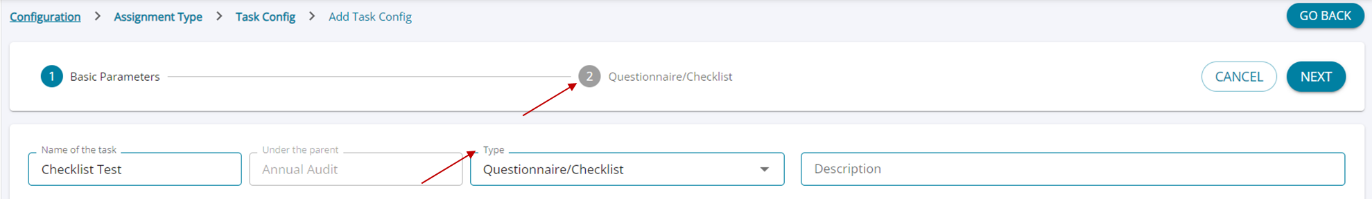 - When the type is chosen as “Questionnaire / Checklist”, step 2 is updated with the requirements for the chosen task.