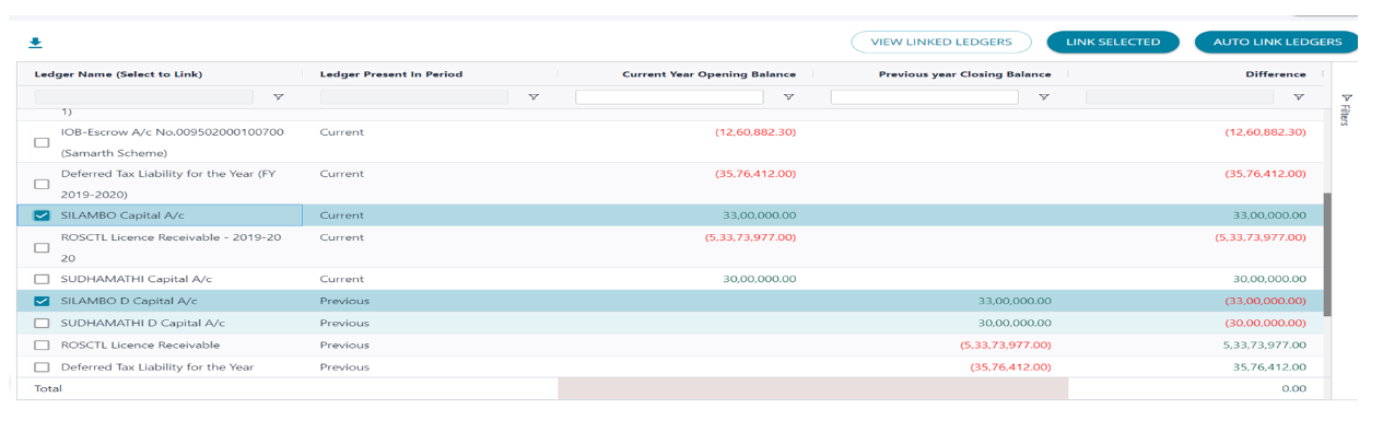 the difference highlighted . The user can also click on the ‘ Auto Link Ledgers’ button and the system will list the ledgers that can be linked as same.