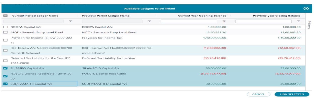 3. The user can select only the ones that they want to map or select the check box next to ‘ Current Period Ledger Name’ on the header row, to select and map all ledgers listed on the page and click on ‘ Link Selected’ at the end of the screen.