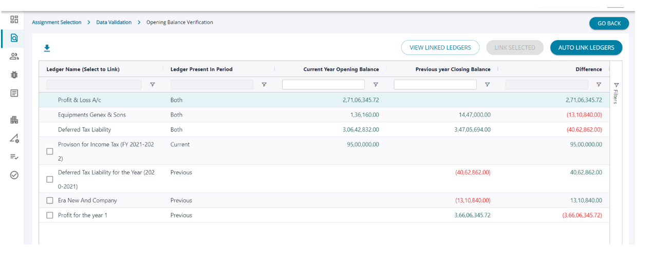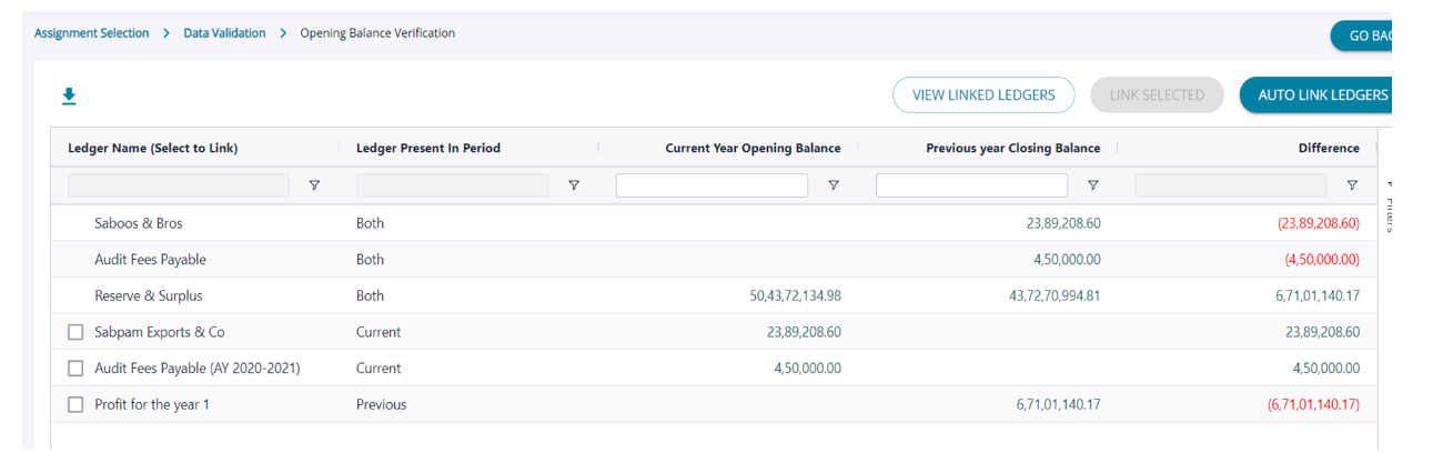 Data Validation - Opening Balance Verification Status – Auto Link ledgers