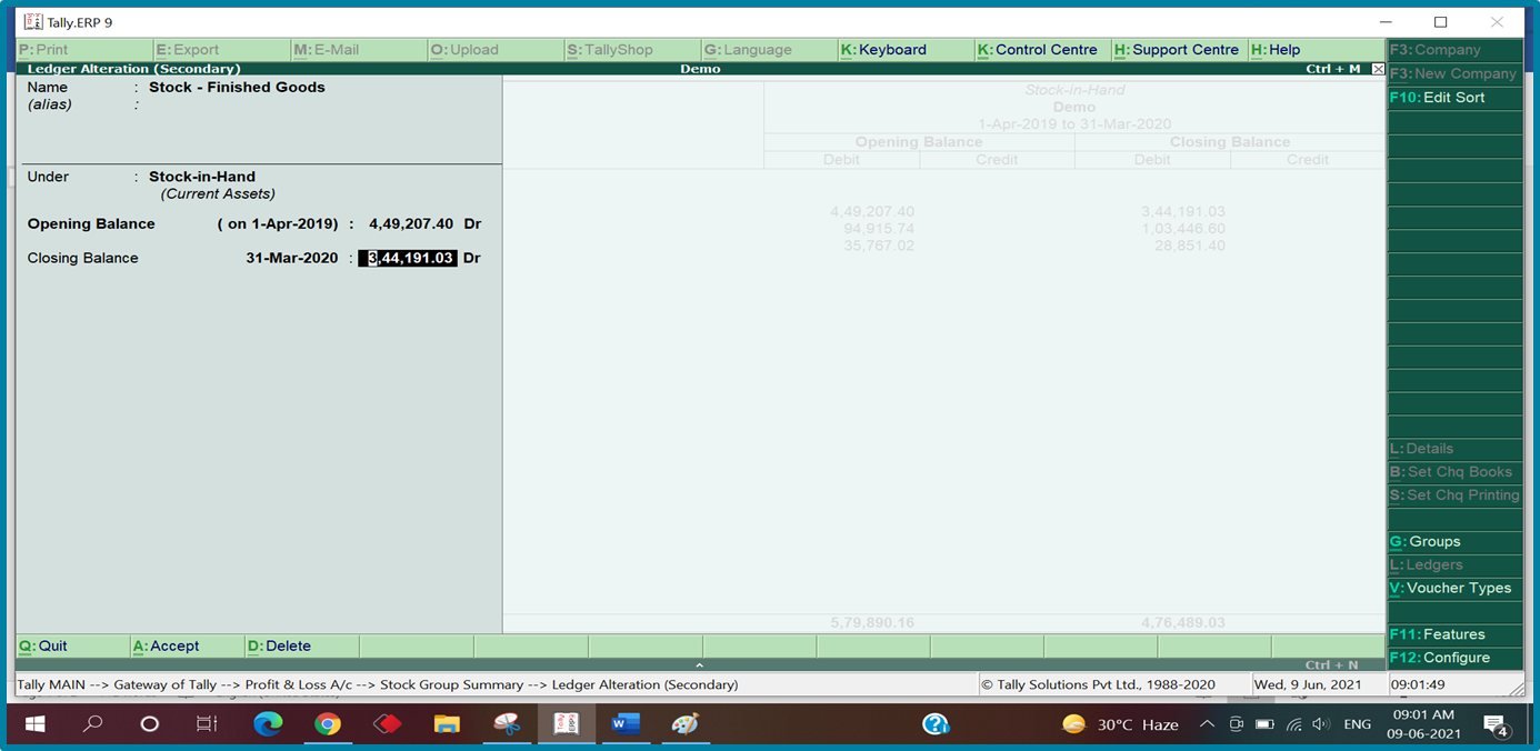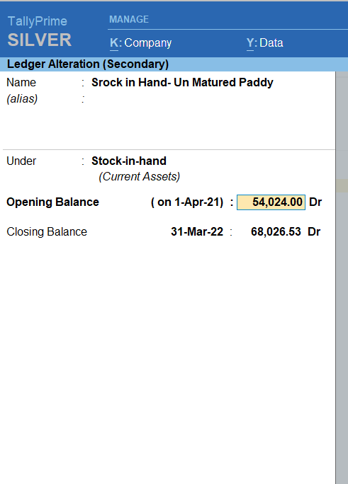 5. Now the user can directly enter the Closing Stock figures under the respective ledgers
