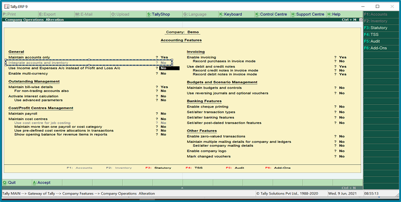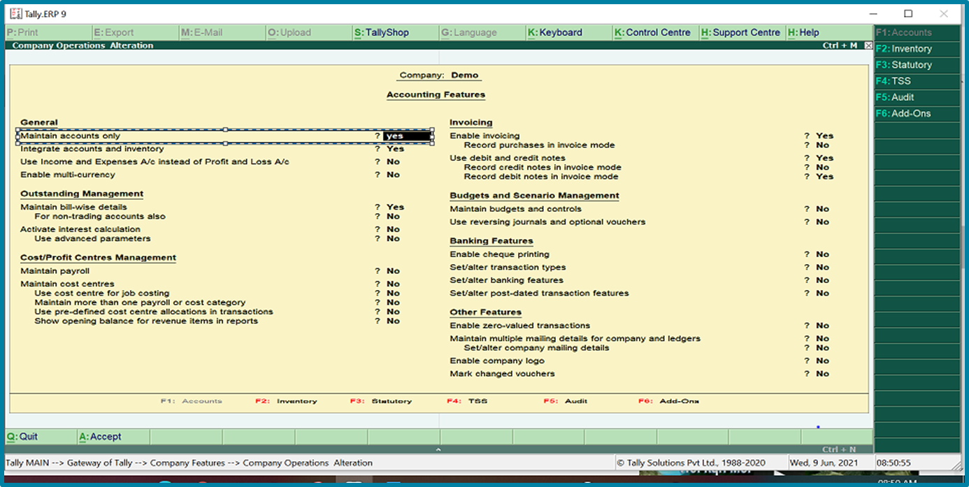 1. Go to--> Gateway of tally ---> F11:Features ---->Accounting Features