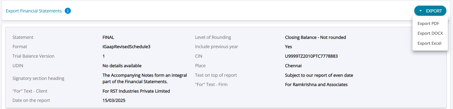 Once the statement is generated, the 'Export Financials' button will be enabled.