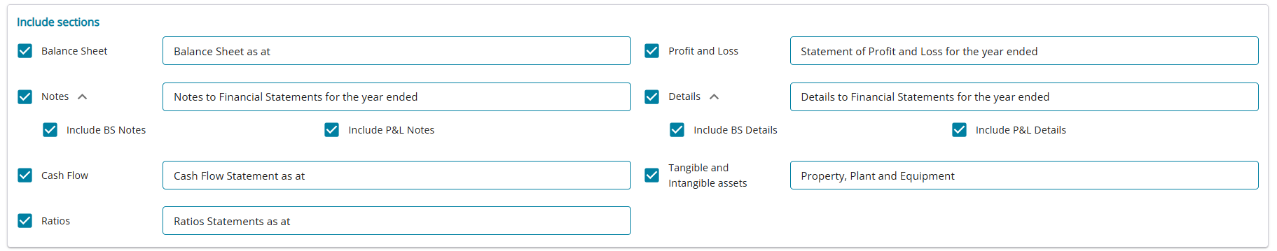 - When "Notes" is selected, the user is allowed to select "Balance Sheet Notes", "P&L Notes"