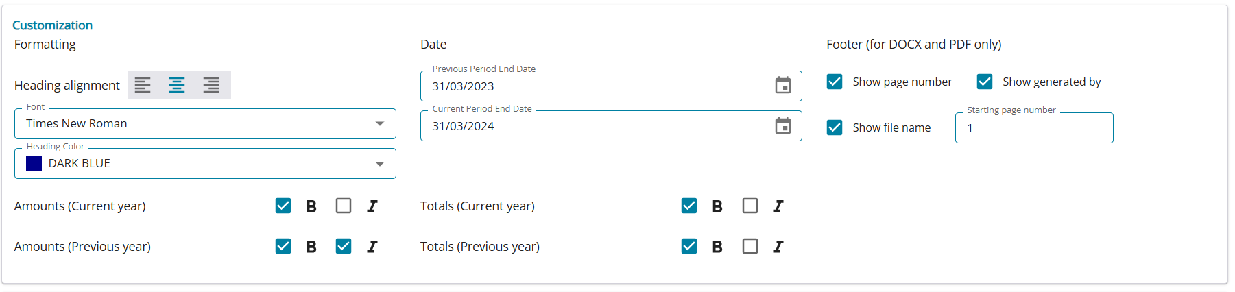 The Export Financial Statements allow the following customizations: