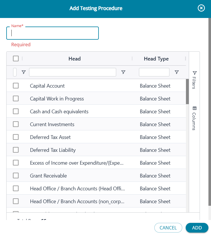 User should enter the name of the new testing procedure required and also select the heads for which it is applicable under both BS and P&L Heads.