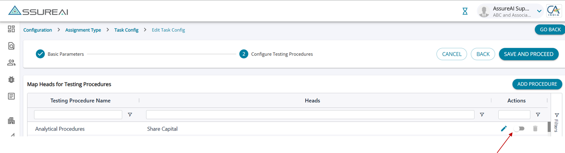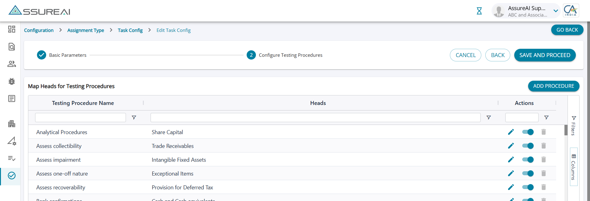 In Step-2 , the system will list to the user all Testing procedures that are available in AssureAI along with the mapping to respective Heads under both BS and P&L.