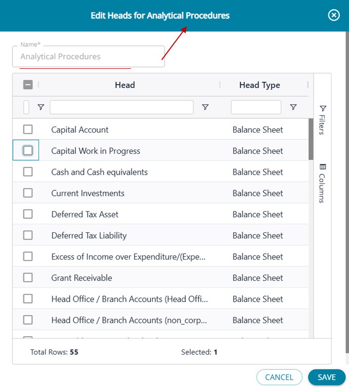 When the user clicks on the Edit button against any procecure name, the pop-up screen below opens up . The screen lists all the Heads ( BS & P&L) and the user can select/unselect required Heads from the list.