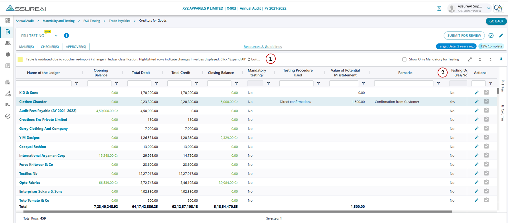 Even if the user selects "Yes" from the drop-down for the Ledger, the % completion is not impacted as the ledger level is not mandated for testing.