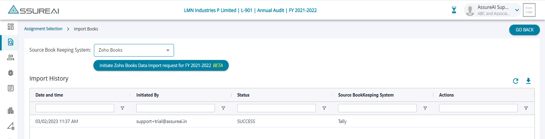 - While Tally import is a two-step process, (export from Tally and Import JSON in AssureAI), Import from Zoho Books is implemented as a direct pull of data