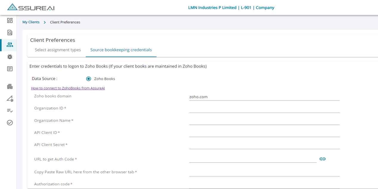 - The user’s Zoho Books credentials are to be configured in “Client Preferences” > “Source Bookkeeping credentials”. The highlighted link below includes step-by-step instructions