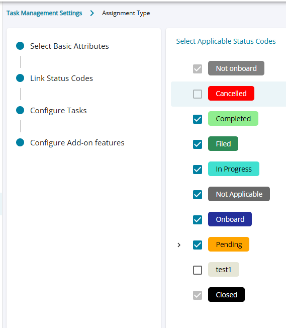 - Users can select the specific status codes they want to apply for the current Assignment Type by using the available checkboxes. All assignments created under this Assignment Type will use only the selected codes.
