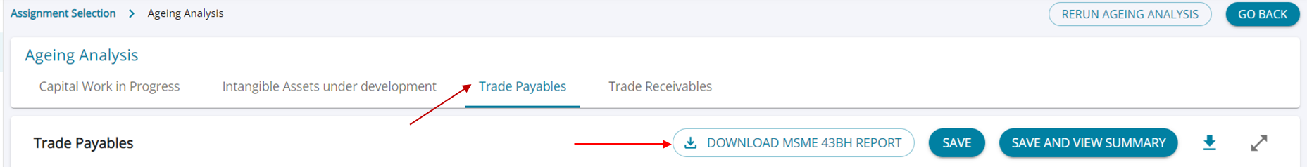- The report can be generated by clicking on the “Download MSME 43BH Report” on the Ageing Analysis screen under Trade Payables.