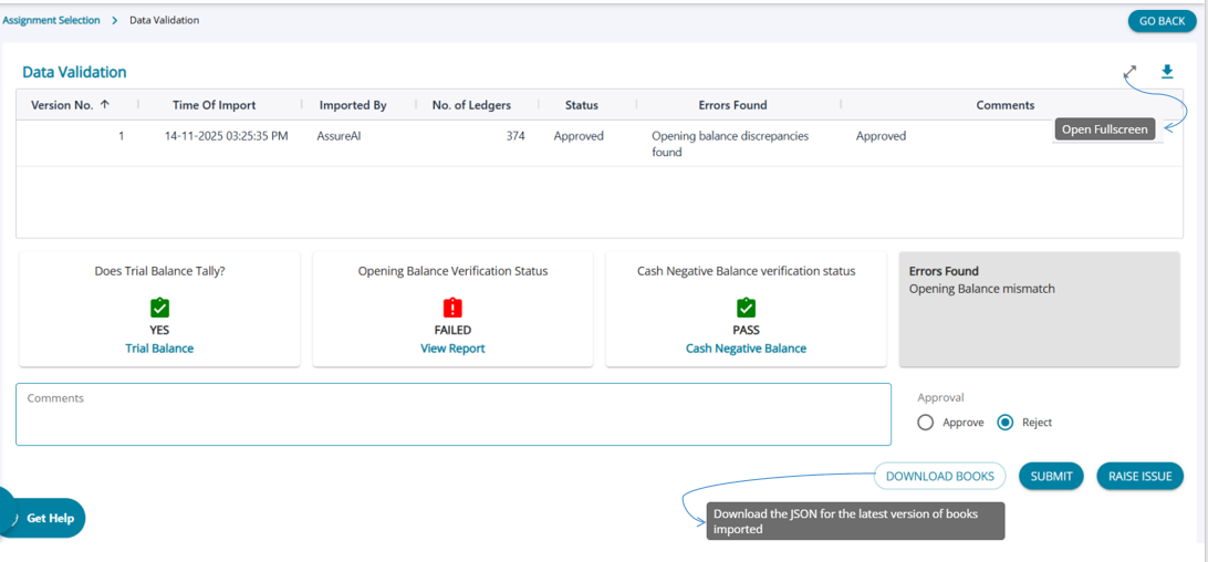 13. A log of all the approvals and rejections with comments will be saved and shown in the top of the data validation screen.
