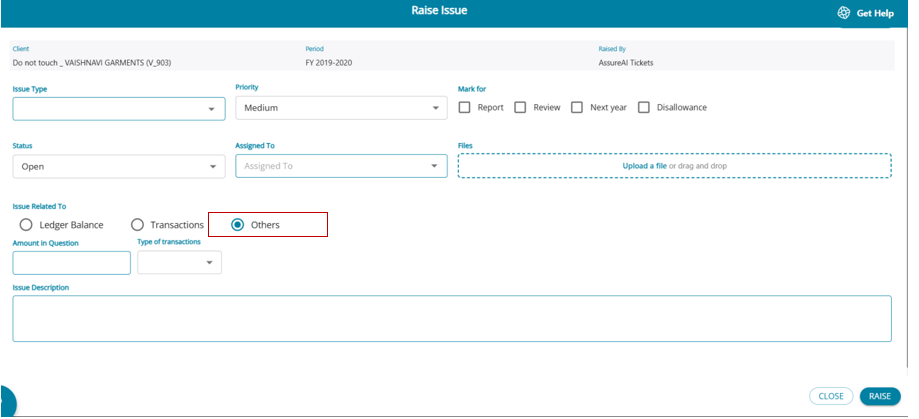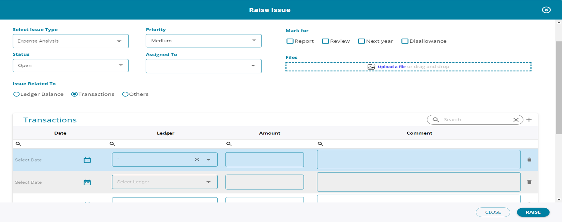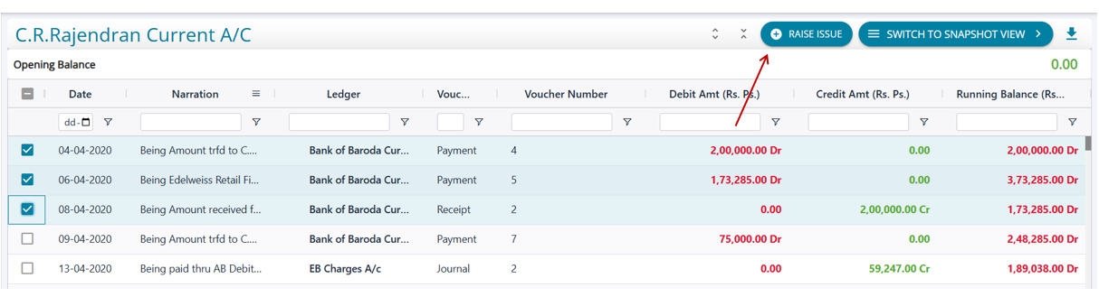 While at a transaction level, if the user wishes to raise issues on 1 or multiple transactions, the ledger view screen can be used to directly raise an issue.