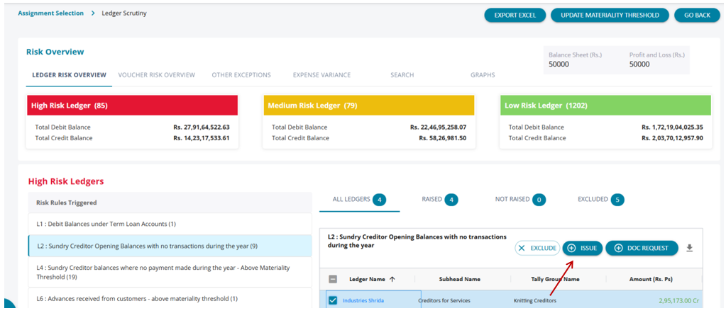 On the Ledger/Voucher Scrutiny screens, the system automatically identifies and displays a list of ledgers and transactions flagged as high or medium risk based on predefined rules. Users can select the corresponding checkboxes to raise issues specific to each flagged rule for individual ledgers or transactions.