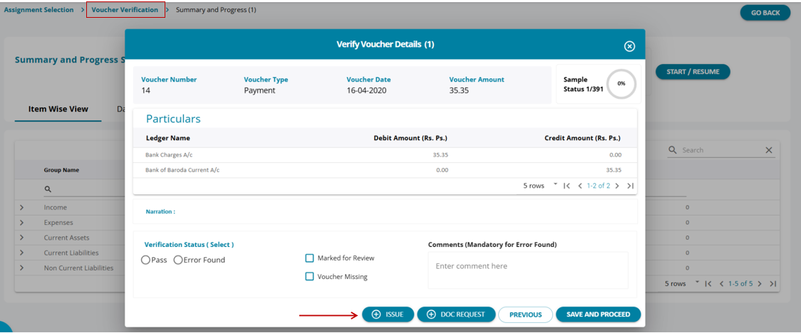 When verifying vouchers individually, users can mark vouchers as 'Pass' if they are correct. For vouchers that require further review or are missing, users can raise an issue directly from this screen.