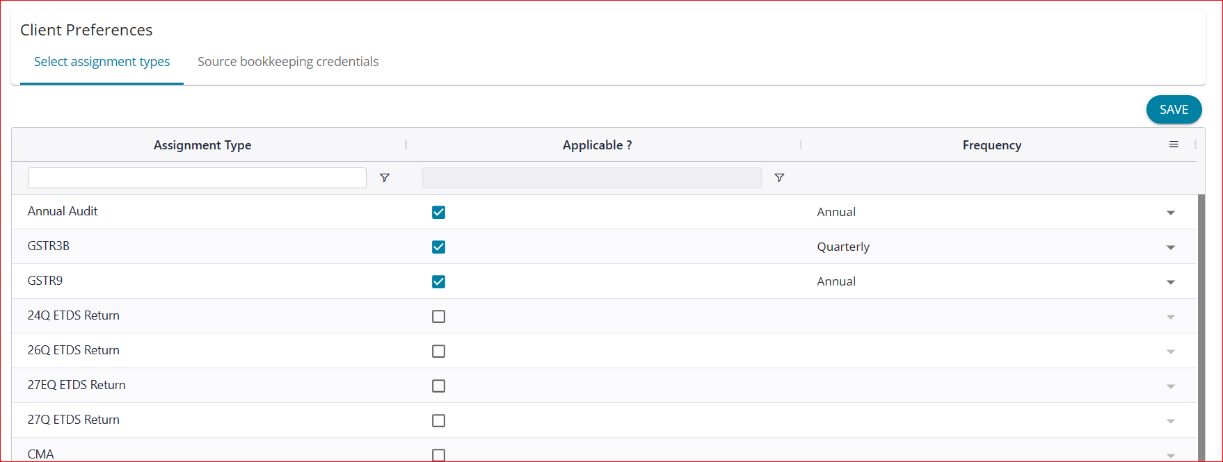 Tick the list of assignments handled for the selected client - and select applicable frequency and proceed to save.