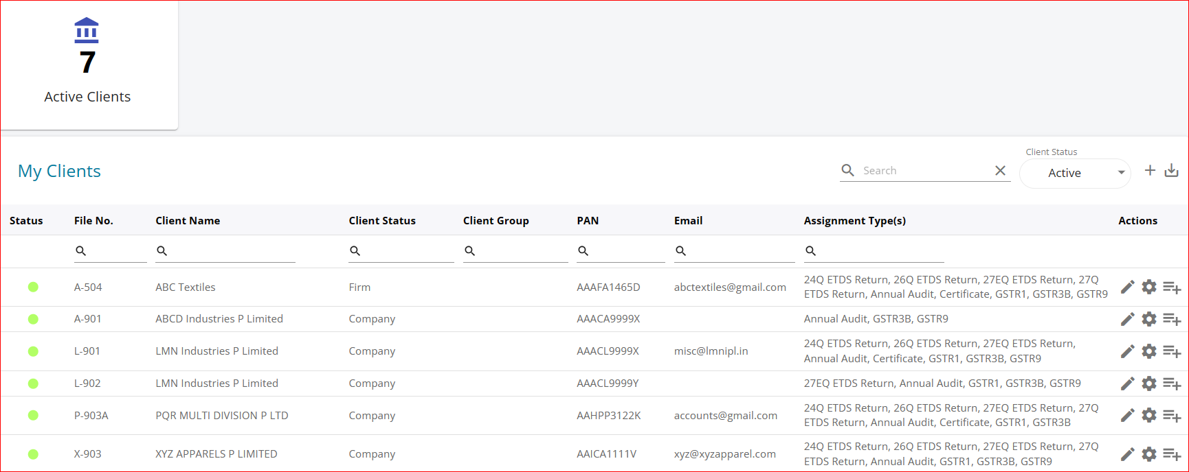 Once a client is created, then it is necessary to select the list of various services that the firm is providing to the selected client. For doing this, click the 'My client' button on the left scroll bar. the following screen will pop up :