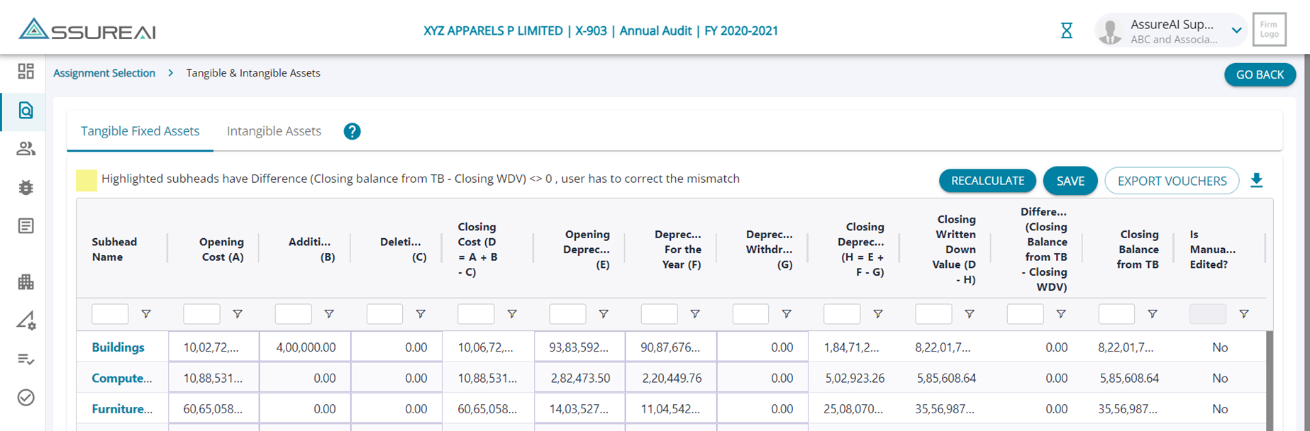 3. As data for all fields are not entered upon first visit, there is difference between the Balance from TB and the Closing WDV , this leads to the rows being highlighted in yellow.