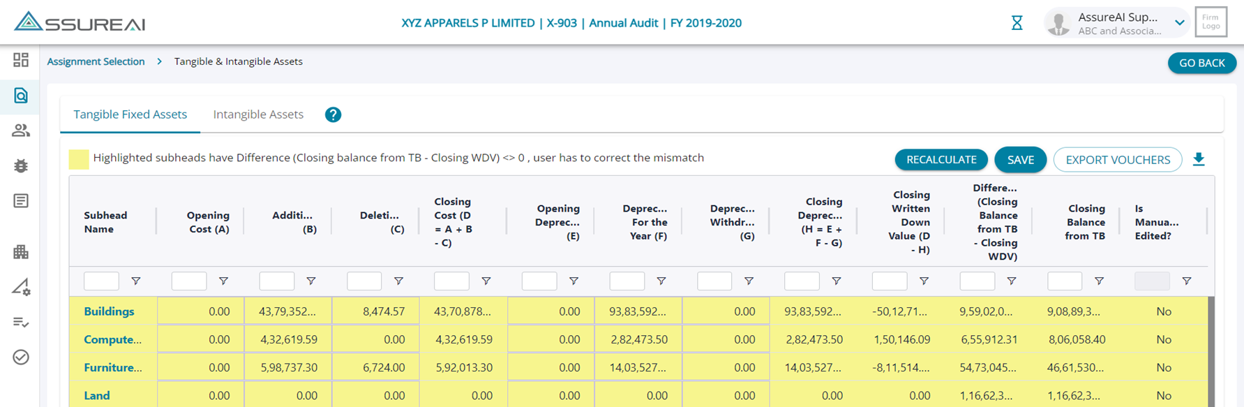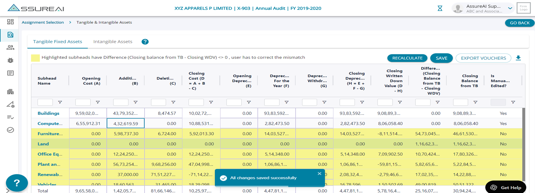 Assure AI has an automated process of updating the Tangible & Intangible Assets table and the system populates for the user data for the columns Addition, Deletion and Depreciation for the Year (Deprecation withdrawn if any is not updated by the system and user has to manually enter the numbers)