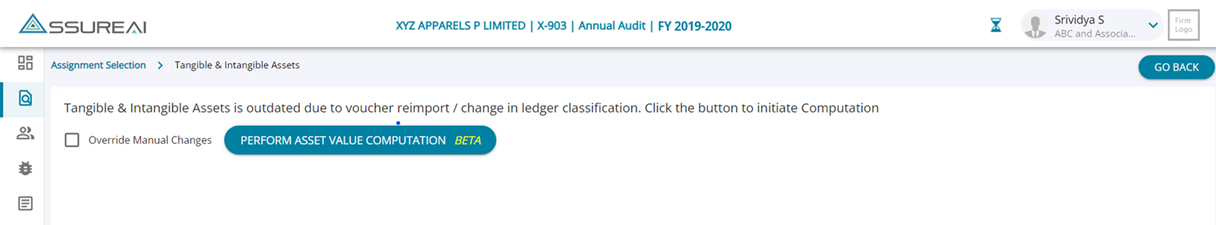 1. During subsequent visits to the Tangible and Intangible assets table if the user has made changes to the books by adding manual vouchers or has re-imported JSON or has changed mapping , the system requires the asset computation to be re-run so if there are changes that impact the assets they can be applied to the table.